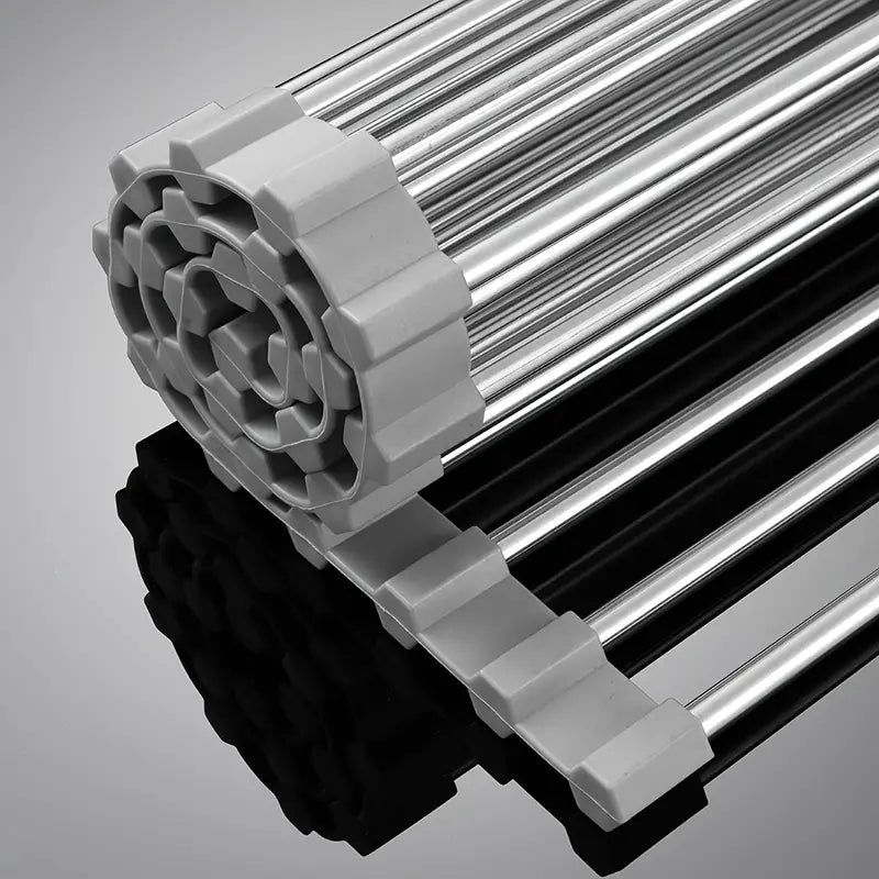 Elevate your kitchen with the RollFlex Stainless Over-Sink Drying Rack, a modern essential designed to maximize counter space while keeping your kitchen clean and efficient. Crafted from premium 201 stainless steel with a soft-touch silicone finish, this roll-up rack provides a sturdy, stylish surface for drying dishes, utensils, produce, and more.